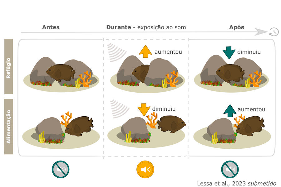 Se você fecha a janela da sua casa quando a obra começa para diminuir o ruído ou muda de lugar quando o ambiente fica muito barulhento, por que achar que as espécies marinhas fariam diferente? É exatamente a mesma coisa. O estudo conduzido por Lessa se debruçou sobre o peixe-donzela, popularmente conhecido como “donzelinha” (Stegastes fuscus), uma espécie-chave na dinâmica de sistemas recifais rasos, porque é herbívoro e tem comportamento territorialista.